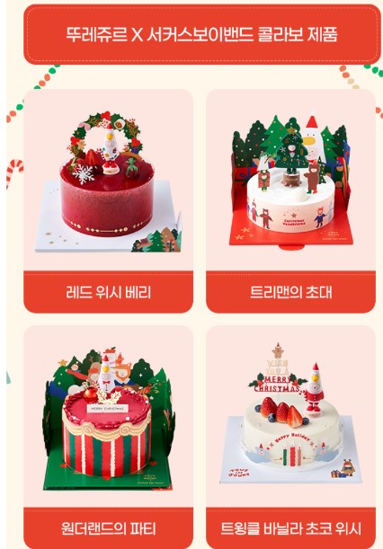 뚜레쥬르는 아트토이 디자인으로 인기가 있는 '서커스 보이밴드'와 '크리스마스 원더랜드' 콘텐트의 크리스마스 케이크를 선보입니다.
