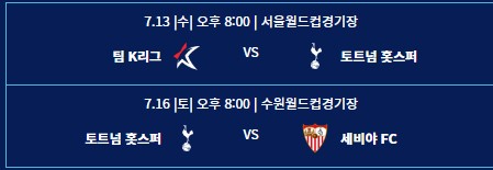 토트넘과 세비야의 경우에는 7월 16일 8시 수원 월드컵 경기장에서 치뤄질 예정입니다.